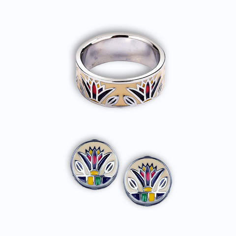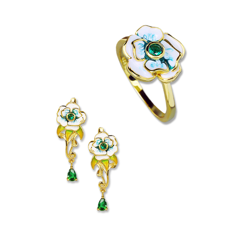 Ensemble de bijoux en émail en forme de fleur exquise faite à la main-nouvelle bague et boucles d'oreilles pour femme pour la fête de fiançailles de mariage ou le cadeau
