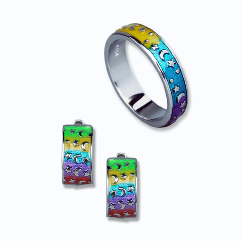 Exquis fait à la main arc-en-ciel couleur émail ensemble de bijoux étoile et lune forme anneau et boucle d'oreille pour les femmes élégant cadeau de mariage à la mode