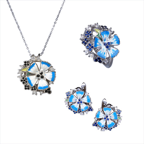 Belle conception de fleur de dessin animé exquis bleu fait à la main émail anneau boucle d'oreille ensemble plaqué or Style à la mode pour les femmes cadeau