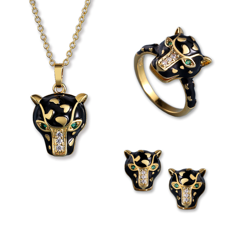 Ensemble de bijoux en émail fait à la main coloré pour les femmes Unique exagérer léopard forme anneau collier boucle d'oreille Zircon pour cadeau fiançailles
